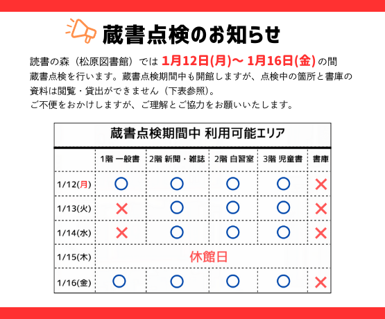 【重要】蔵書点検のお知らせ 1/12(月)~1/16(金)